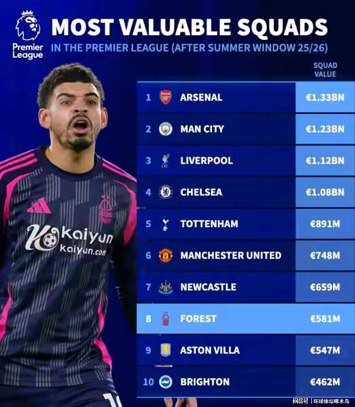 这份榜单本身,就是一部英超财富与实力的浓缩编年史。阿森纳以13.3亿欧元的惊人身价领跑,曼城以12.3亿欧元紧随其后,利物浦、切尔西、热刺和曼联则共同构成了从11.2亿欧元到7.48亿欧元的第二集团。这六支球队,长久以来凭借其雄厚的资本、全球的影响力和稳定的竞技成绩,构筑了英超难以逾越的“BIG6”壁垒。排在第七位的纽卡斯尔联,在经历巨额注资后,身价飙升至6.59亿欧元,被视为最有潜力打破这一格局的新贵。而诺丁汉森林,以5.81亿欧元的估值,力压阿斯顿维拉的5.47亿欧元和布莱顿的4.62亿欧元,稳稳地占据了第八名的位置。