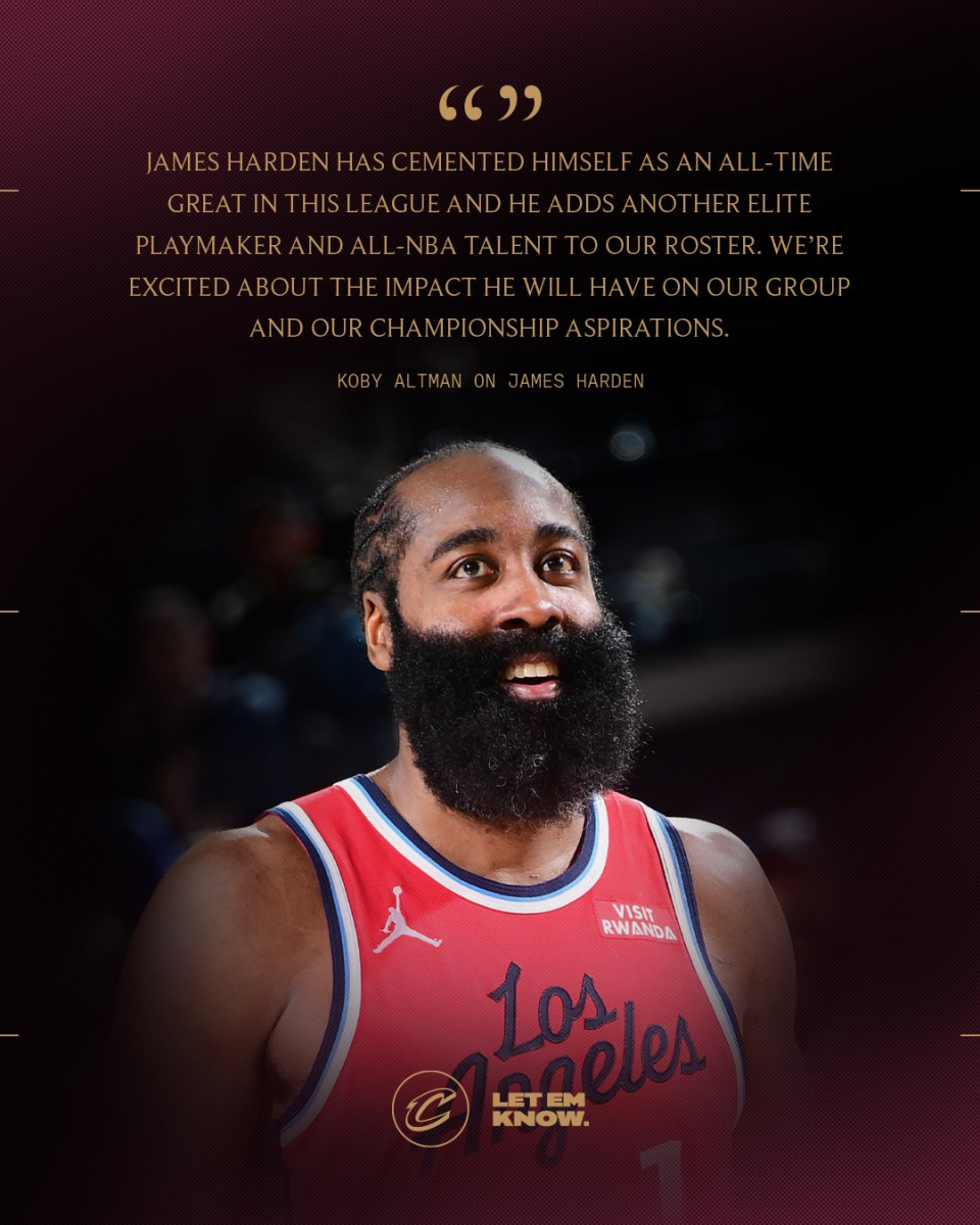 骑士篮球运营总裁科比-奥尔特曼在一份声明中表示:“詹姆斯-哈登早已跻身联盟历史巨星之列,他的加盟将为我们的阵容再添一位精英级组织核心与最佳阵容级别的实力战将。”奥尔特曼表示,“我们十分期待他能为球队带来的改变,以及对我们争冠目标的助推作用。他的到来将提升球队的进攻水准,为队友创造更多得分机会,同时在攻防两端为球队注入宝贵的季后赛经验。”